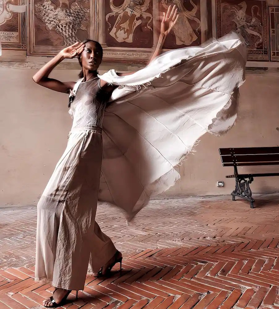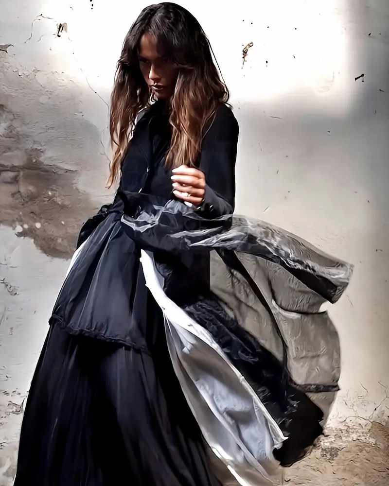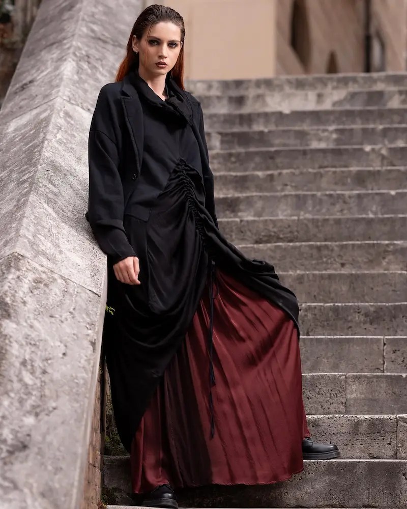 La ropa de SANCTAMUERTE es poética como un viaje interior, transversal a las épocas, romántica y profundamente italiana. Explorando y rompiendo la norma a través de formas distintivas, la ropa de SANCTAMUERTE lleva la sastrería a nuevas dimensiones.